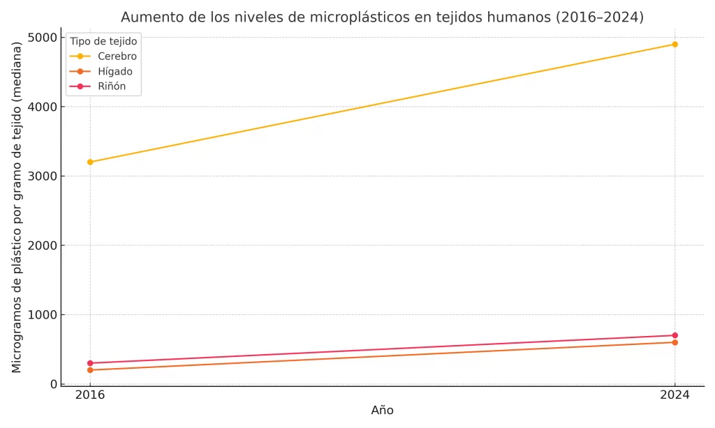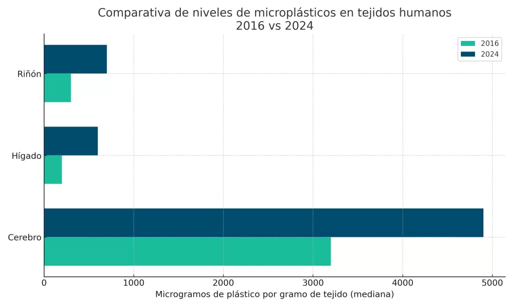 Tendencia temporal y aumento reciente: Un hallazgo crítico del estudio es el incremento de la carga de microplásticos a lo largo del tiempo. Al comparar las autopsias de 2016 con las de 2024, las concentraciones en 2024 resultaron mucho más altas en el cerebro (aprox. +50% de aumento).